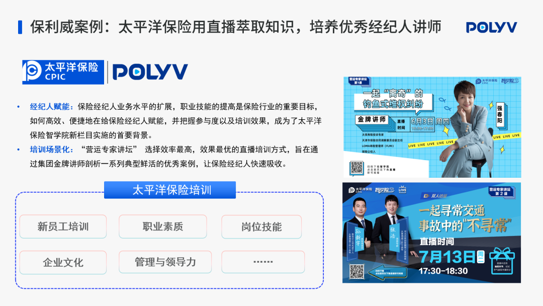 太平洋保险通过保利威直播将培训场景线上化,让金牌讲师剖析典型案例,帮助保险经纪人快速提升业务水平,提高职业技能。