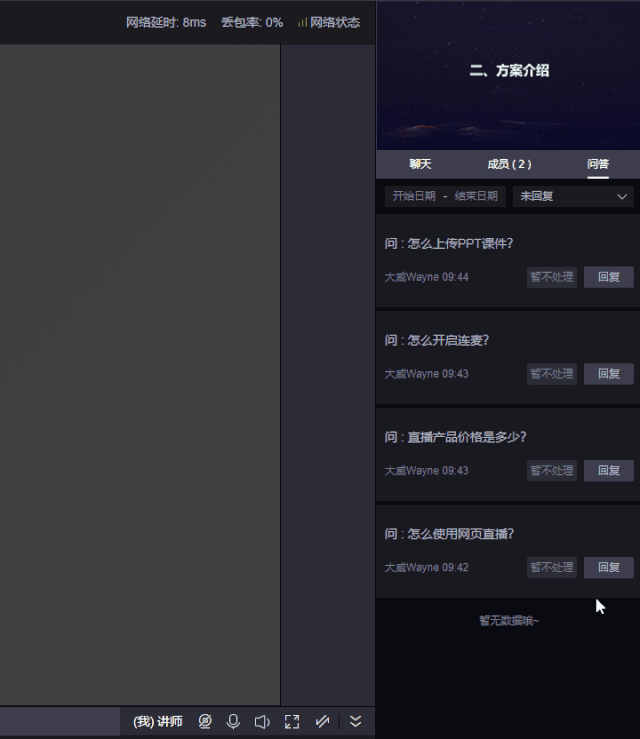 第四,聊天问答区沉淀精华。直播聊天窗口可设置问答区,学员在问答区提问后,讲师可以选择问题进行回答,被回答的问题会留存在问答区,方便沉淀典型问题,节省老师重复回答的时间成本。