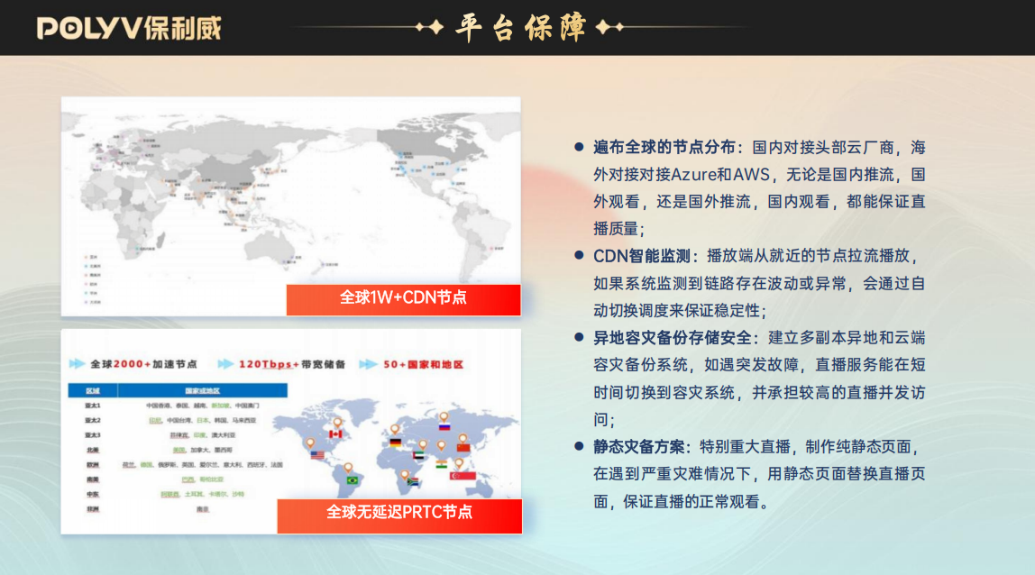 多会场多人同步观看不能断流,连麦互动、实时抽奖等环节要流畅,避免关键场景“掉链子”。保利威PRTC核心基于WebRTC的UDP传输特性构建,重点解决了WebRTC在高并发场景下的稳定性瓶颈,形成“低延迟+高可靠”的企业级技术定位。保利威通过自研传输控制逻辑,平衡UDP的高速传输优势与大规模并发场景的稳定性需求,保障年会万人并发不卡顿。集成DDoS/CC攻击防护,支持WAF规则拦截、流量清洗,确保直播内容安全可控。