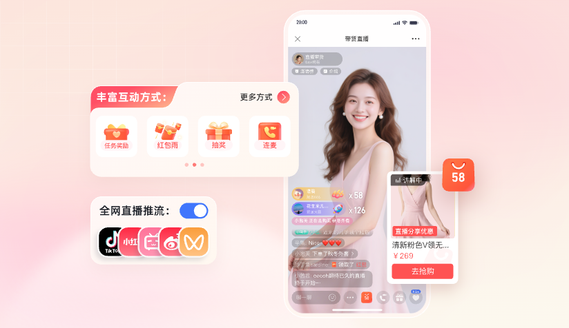 提供邀请有礼、签到奖励等多样营销互动玩法。针对不同环节的核心需求匹配精准玩法,拉动直播商品GMV成交率:直播互动环节,以提升观看时长/直播间停留率为目标,提供红包打赏、抽奖、弹幕、连麦等玩法;商品运营环节,以提升商品点击率/转化率为目标,提供优惠券、商品卡片推送、商品讲解回放购买、积分等玩法……